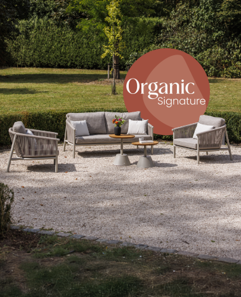 Of je nu kiest voor de royale lijnen van de Olympus of de verfijnde uitstraling van de Valencia, deze stijlrichting brengt een volwassen en vertrouwde sfeer naar je terras. De Organic Signature vind je terug in een brede selectie van onze bekende namen, van de Girona tot de Lima en de Mont Blanc.